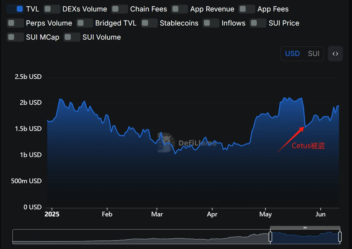 5 月 22 日,Sui 生态的去中心化交易平台 Cetus 遭遇黑客攻击,损失金额约 2.23 亿美元。这起事件对生态整体造成较大冲击,不仅引发用户恐慌,也直接导致链上资金流出。根据链上数据,Sui 网络的总锁仓量(TVL)从高点约 21 亿美元下滑至最低 15.7 亿美元,跌幅超过 25% ,生态整体面临严峻考验。