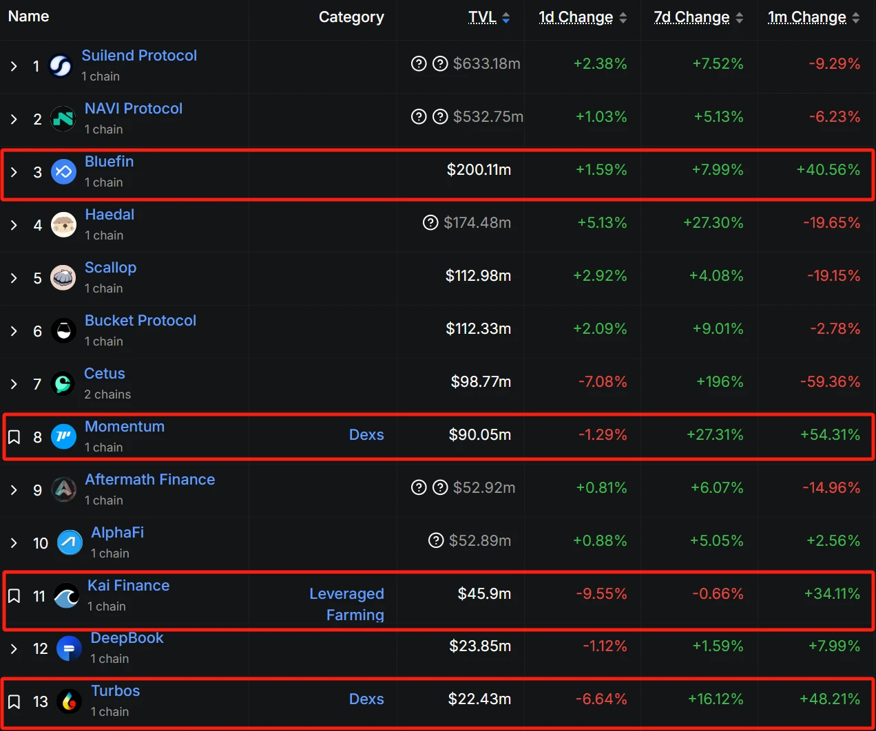 在这场“灾后修复”过程中,四个协议在 TVL 和用户增长方面表现突出,分别是 Momentum、Turbos、Bluefin 和 Kai。