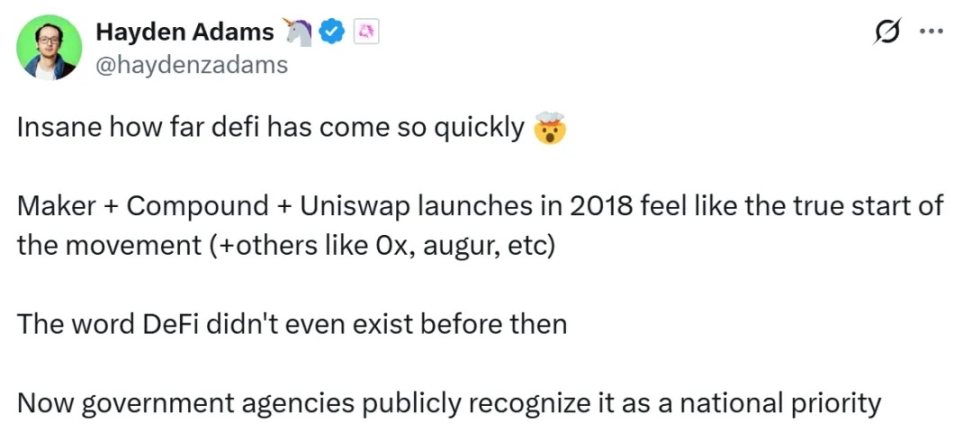 DeFi 发展得如此之快,真是不可思议?。就在 2018 年,MakerDAO + Compound + Uniswap 的上线,感觉像是 DeFi 运动的真正开端。在那之前,「DeFi」这个词甚至都不存在。7 年后的现在,政府机构公开承认它是国家优先事项!