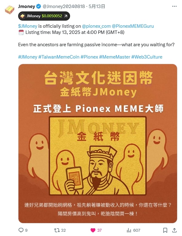台湾迷因币加快出圈》金纸币JMONEY上架Pionex、Ourbit,6/14登陆HiBT
