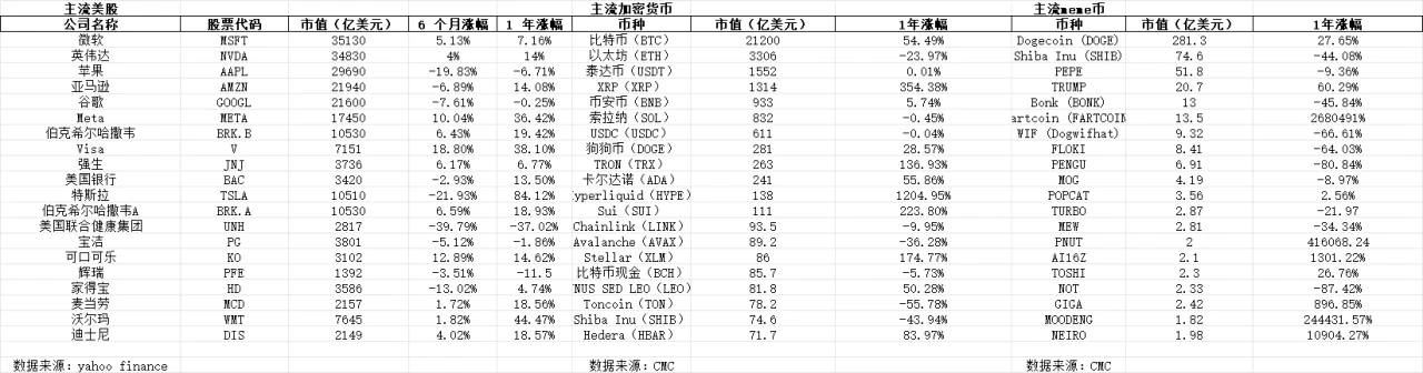 与此形成鲜明对比的是,加密市场的主流币和 Meme 币表现极为分化。比特币一年涨幅 54% ,以太坊 36% ,但 SOL、TRX 等主流币甚至出现负增长,Meme 币板块更是涨跌互现,PEPE 一年涨幅超 200% ,而 TURBO、WIF 等币种则跌幅巨大,甚至高达-80% 以上。加密资产的高波动性和高相关性,使得投资组合难以实现有效分散,牛市时追逐热点,熊市时资产大幅缩水,缺乏像美股这样稳定的“基本盘”。