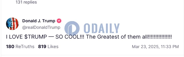 3 月 23 日,特朗普在社交媒体 Truth Social 上发文:我爱 TRUMP,非常酷,他们都非常伟大。消息一出 TRUMP 两日上涨超 20% ,最高达 12 美元。而后回落。