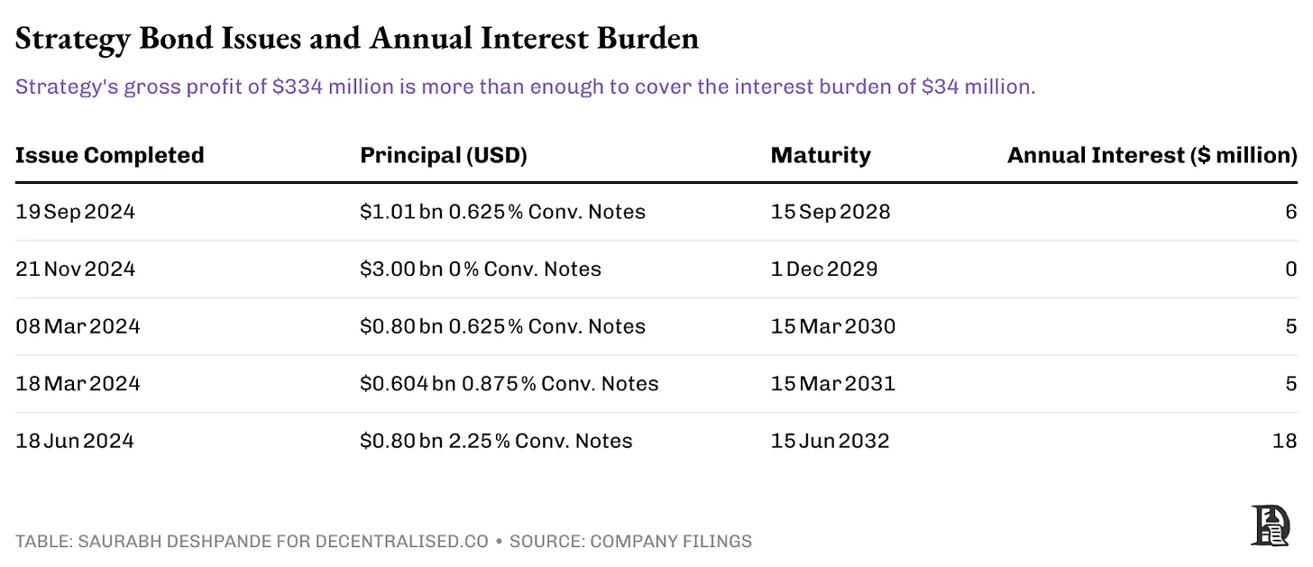 但这种风险有多大呢?MicroStrategy 的年度利息负担总计为 3, 400 万美元,而 2024 财年的毛利润为 3.34 亿美元,足以偿还债务。MicroStrategy 发行了与比特币四年周期相关的可转换债券,其到期时间足够长,以减轻价格下跌风险。因此,只要比特币在四年内上涨超过 30% ,新股票发行就可以轻松支付赎回费用。