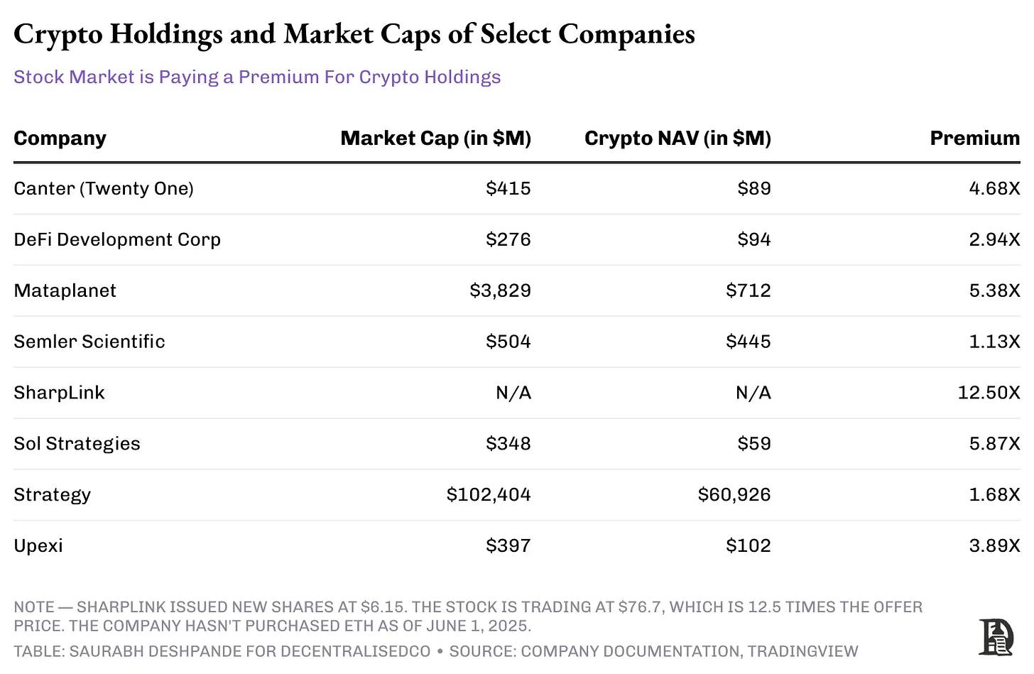 在今天的文章中,Saurabh 详细解读了企业如何通过向资产负债表中添加加密货币来实现其实际价值的溢价。以 MicroStrategy 为例,这家公司季度营收仅略高于 1 亿美元,却持有价值近 109 亿美元的比特币。全球已有 80 家企业探索如何将加密货币纳入其资产负债表。传统金融机构对此表现出极大的兴趣,并为这种股票的波动性和潜在收益支付了溢价。