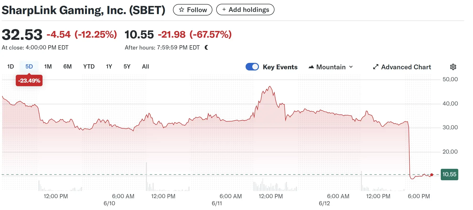 SharpLink Gaming,被市场捧为“以太坊版微策略”的明星小盘股,原本正踩在 ETH 国库叙事的风口上,一份 SEC 文件,却让其股价在盘后暴跌近 70% 。