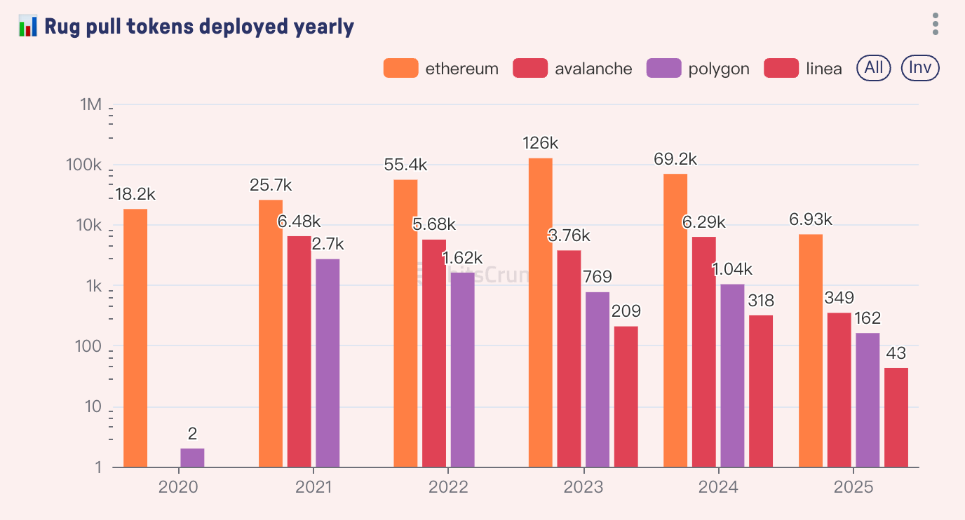 高达数十万计的欺诈代币和部署者数量,表明 Rug Pull 已绝非零散的小偷小摸,而是一条分工明确、工具化、流程化的成熟黑色产业链。诈骗成本极低,而潜在“收益”巨大。用户需要了解 Rug Pull 的常见手法(高额回报承诺、匿名团队、无审计、流动性锁仓可疑或缺失、社交媒体炒作、短时间内拉盘等)。查看合约是否开源、是否经过知名审计机构审计、团队背景是否可验证、流动性锁仓情况等应成为投资前的必备步骤。