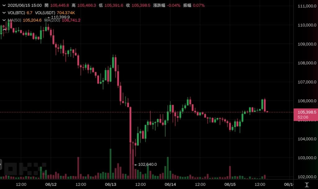 以 色列与伊朗冲突本周极速升温,风险资产普遍震盪的背景下,比特币虽有受影响,但反弹的也很快,今日午间一点后一度回弹至 10.6 万美元,截稿前现报 105,398 美元。