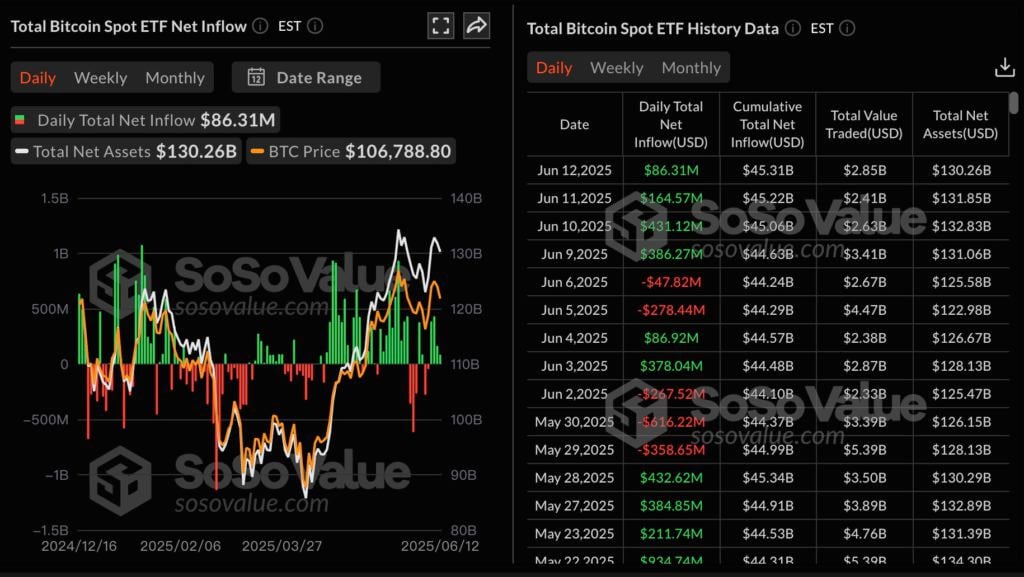 BTC 触及 10.6 万美元,比特币现货 ETF 连续五天净流入
