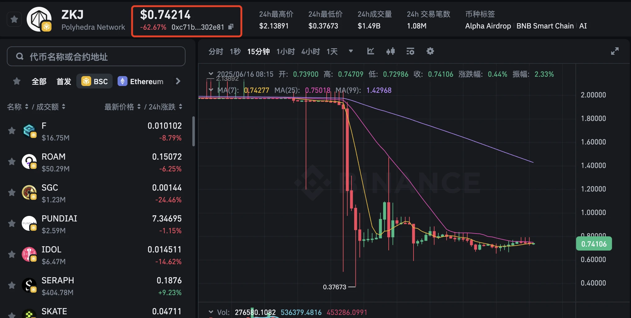 Binance Alpha 上的 BSC 链上 ZKJ 代币价格