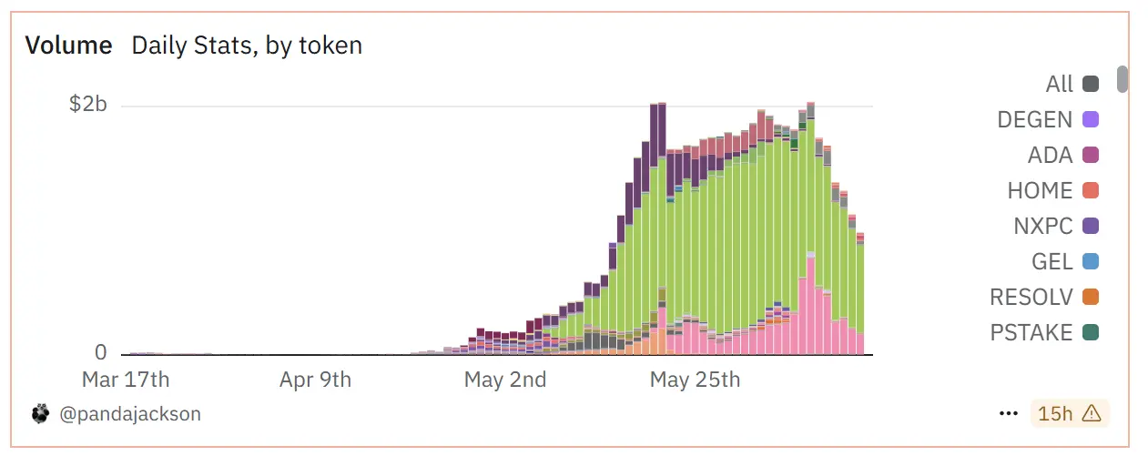 与此同时,ZKJ 也面临关键时间点:6 月 19 日将迎来约 1553 万枚代币的大额解锁,占当前流通量的 5.04%,市值约为 3030 万美元。再叠加近期 Alpha 活动整体交易量显著下滑,赚钱效应减弱,流动性提供者自然会重新评估继续参与的性价比。
