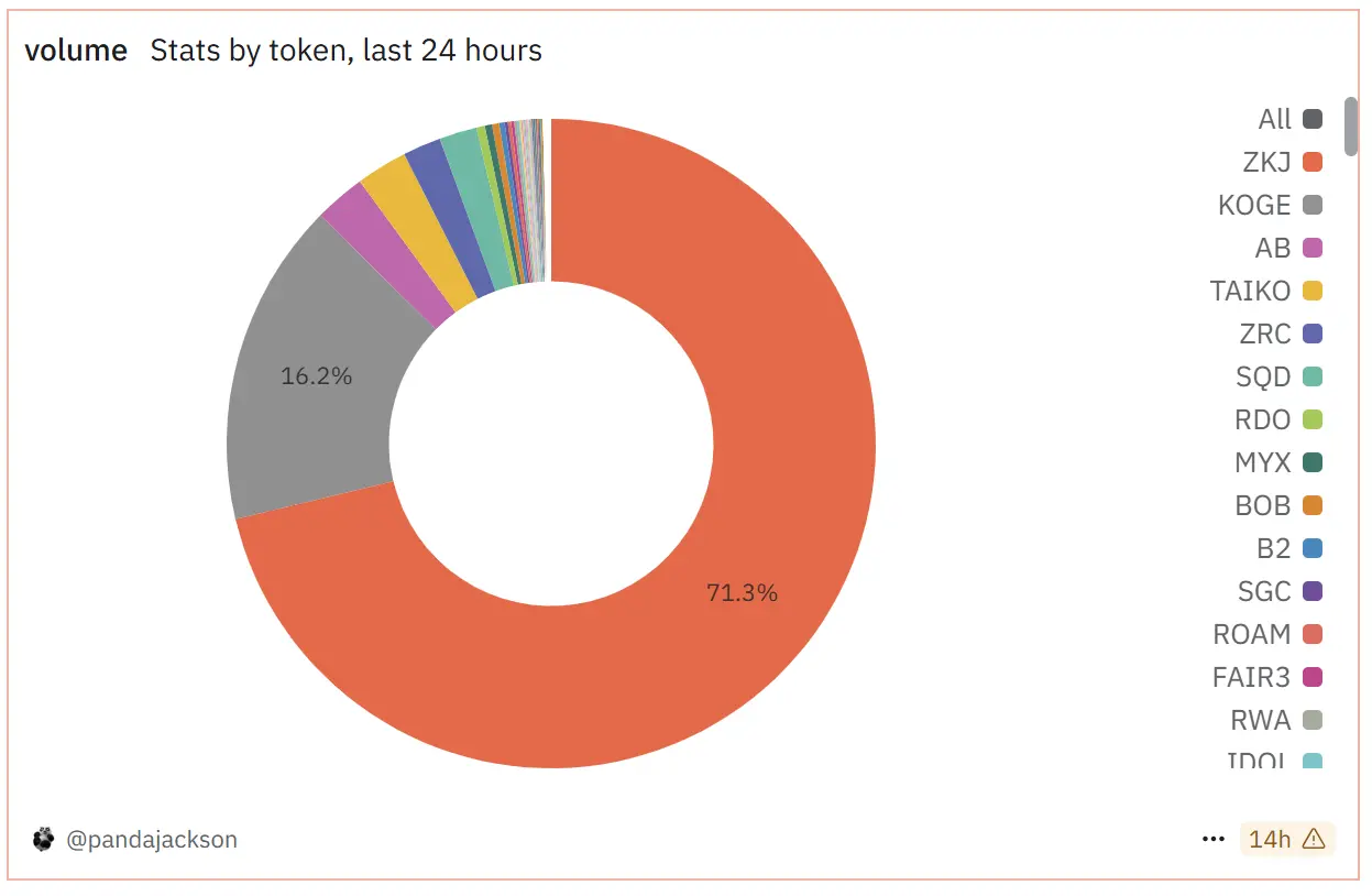 在Binance Alpha 这场游戏中,用户普遍偏好用“磨损低”的代币来冲量,而 ZKJ 与 KOGE 正是刷量工具的代表,两者占据 Alpha 代币交易量的 87%以上,尤其是 ZKJ,已连续一个多月被用户用于刷分。