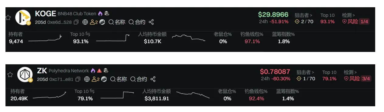 然而,ZKJ 与 KOGE 的筹码高度集中,KOGE 前十大地址持仓占比高达 93%,ZKJ 也接近 80%。在刷量造势的背后,实则一直隐藏着随时可能被“控盘者”引爆的流动性风险。