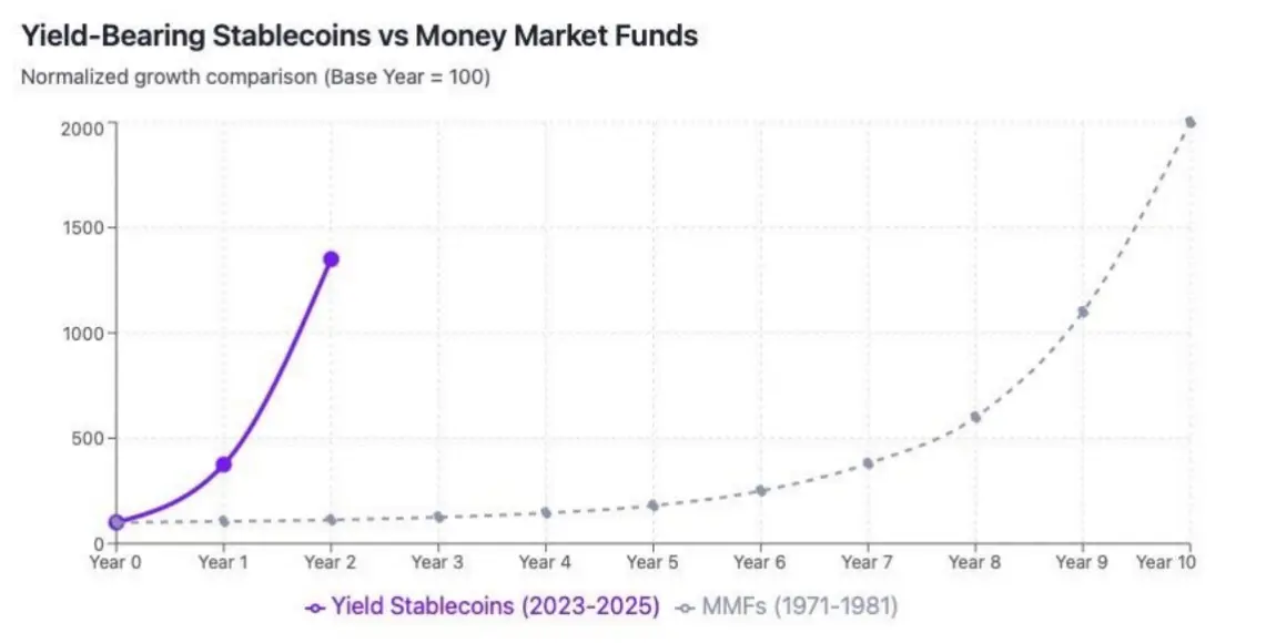 收益型稳定币正沿着一条远超传统货币市场基金的发展路径迅速扩张。货币市场基金于 1971 年推出,截至 2025 年 5 月已成长为一个规模达 7 万亿美元的产业;类似地,收益型稳定币也正满足市场对现金等价资产实现自动化收益的需求。