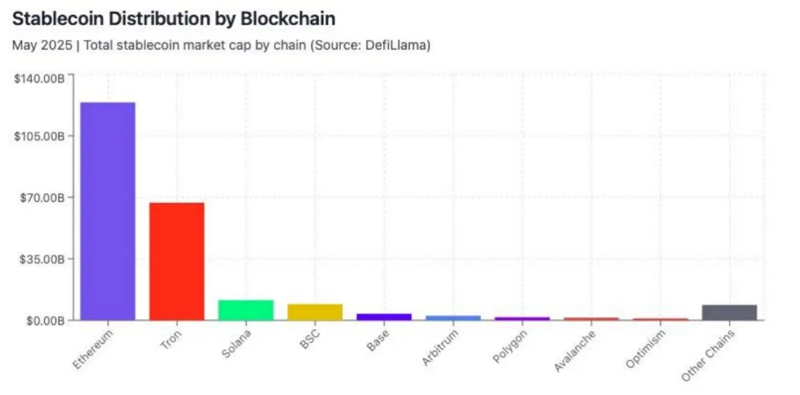 以太坊承载了约 1240 亿美元的稳定币 TVL,占据整个市场的 52%。其中,USDC 占比约 42%,USDT 占比 34%,DAI 占比 18%。其在去中心化金融协议中的机构级采用(如 Aave,目前约有 400 亿美元的稳定币存款)是其持续增长的主要驱动力。