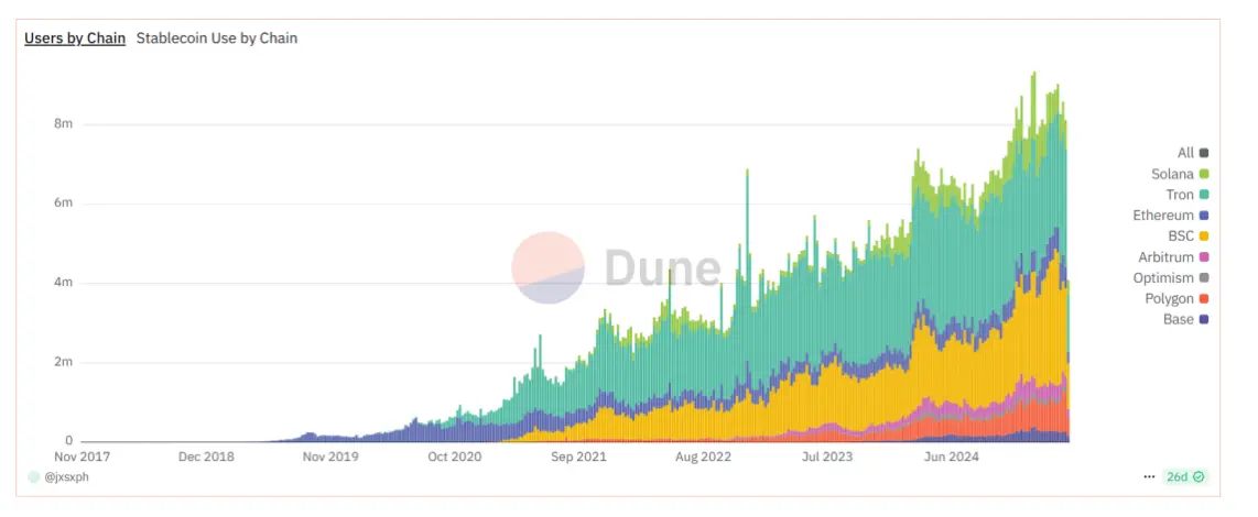 Tron 以每周 310 万活跃稳定币用户居首,尽管年增长率相较其他竞争者较为温和。尽管如此,该网络处理了全球 41% 的稳定币交易,主要得益于其在高价值、低频次的 USDT 转账中发挥的核心作用,每月交易额超过 5000 亿美元。Tron 的基础设施对机构级流动性至关重要,在高交易量与用户增长放缓之间实现了平衡。
