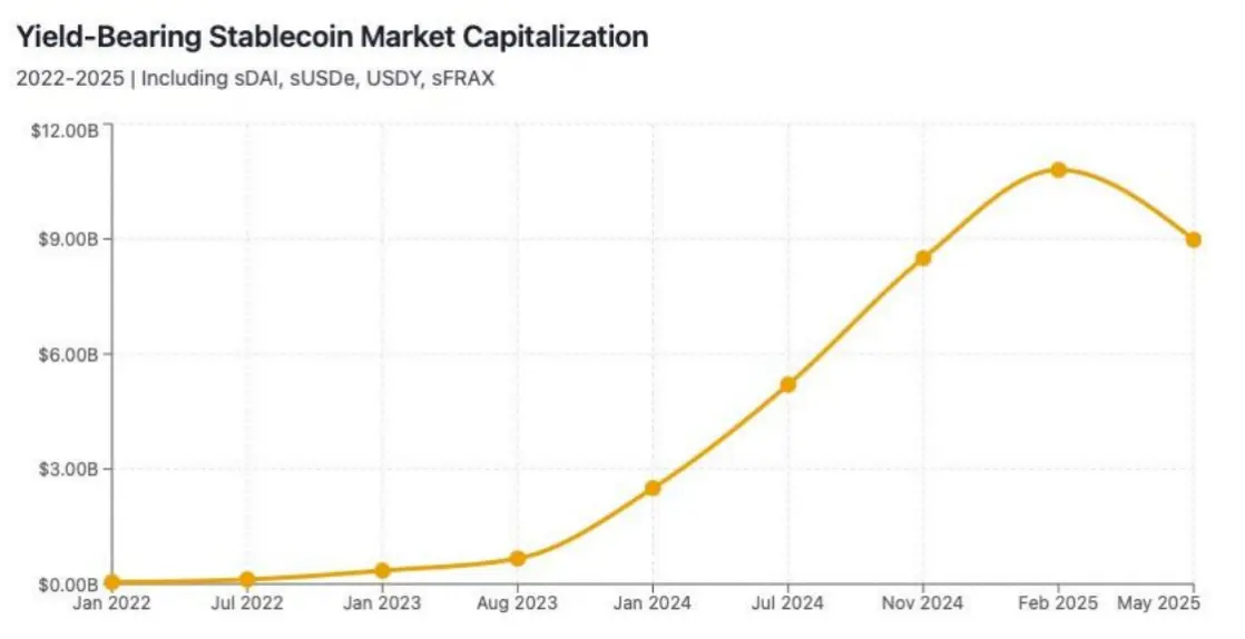 近期,市场上出现并迅速采用了可产生收益的稳定币,其规模从 2023 年 8 月的 6.6 亿美元增长至 2025 年 5 月的约 90 亿美元,增长了 13 倍,占稳定币市场总规模的约 4%。若这一增长趋势持续,该赛道有望在未来数年内占据稳定币市场的 50%,总锁仓量可能达到数千亿美元。