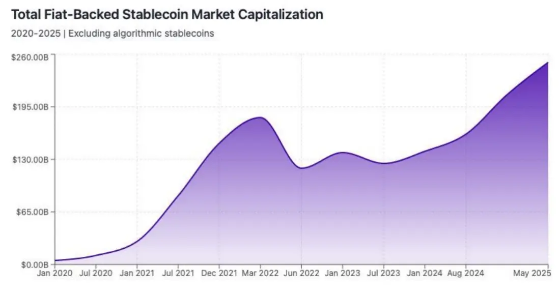 稳定币市场已牢固确立其作为数字金融核心支柱的地位,其总市值实现了惊人的增长——从 2024 年 2 月的 1380 亿美元上涨超过 60%,至 2025 年 5 月突破 2300 亿美元。稳定币最初被设计为对抗加密货币高波动性的价格锚定资产,而如今,它们已成为支撑全球数万亿美元交易活动的关键工具。