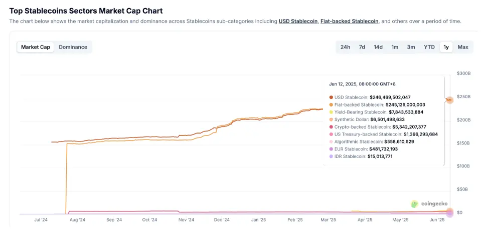 · 避险与流动性需求:全球宏观波动加剧,法币通胀与资本管制使市场对 USD 计价、链上实时清算的资产产生刚需,据 Coingecko 最新数据,稳定币流通市值已突破 250 B 美元。