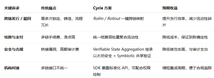 多链稳定币清算网关:发行方可在 Chain A 铸造 USDC, 通过 Cycle 结算层将同额资产无桥映射至 Chain B,零滑点完成商户收款。对用户而言,支付路径与传统卡支付无异。