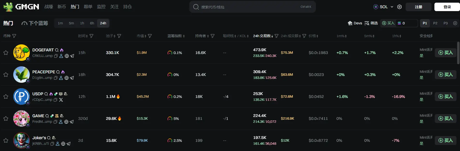 过去 24h Solana 热门代币前五依次为:DOGEFART、PEACEPEPE、USDP、GAME、Joker's