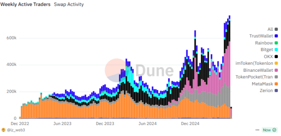 想象很美好,但理想很丰满。Binance Alpha上线后,在将近2个月内上线了超过80个代币,过高的上币率引发了流动性抽水的质疑,市场也不像币安预料般对交易量予以支持,代币上线即崩塌的情况并未得到改善,被寄予厚望的Web3钱包也表现平平。从数据而言,直到2025年3月17日,币安Web3钱包在所有被追踪的Web3钱包总交易量中占比仅有8.3%。