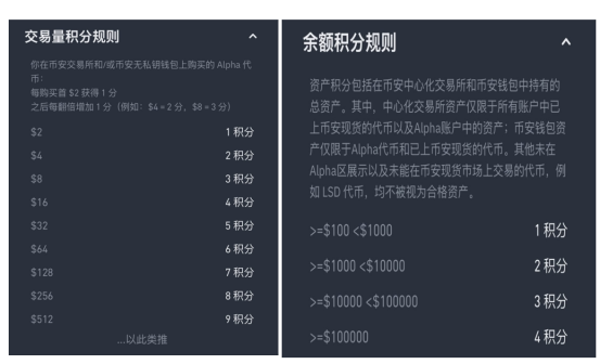 仅仅靠外部老对手来送温暖,要实现堪称爆炸性的增长仍然不足,在此之中,起到关键作用的,正是Alpha后续推出的的积分系统。相比1.0,Alpha 2.0增添了Alpha Points积分体系。该积分系统根据用户在 Binance Alpha与Binance Wallet 中的资产持仓与交易活动进行积分计算,作为空投、TGE等后续活动的参与门槛。积分体系采用每日快照机制,周期为15天,即考察过去15天的持仓与交易行为。
