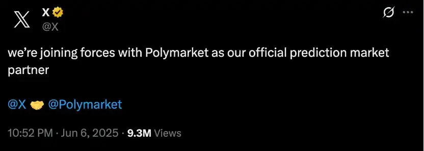6 月 6 日,X 正式宣布与 Polymarket 建立合作关系,成为了 X 官方预测市场合作伙伴,X 将向 Polymarket 提供数据驱动的洞察,而 Polymarket 的预测结果则会反向反馈至 X 平台,结合来自 Grok 的实时解读和相关 X 帖子,实现可解释的预测数据流。这一合作推动 $Pcule 的币价创下历史新高。