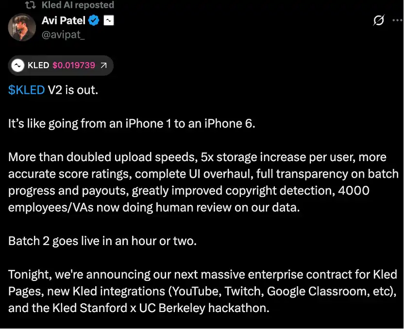 Kled 是一个 AI 数据交易平台,通过通过提供视频、音频、文本等数据成为 AI 开发者与数据版权方的中介。该项目由曾投资过 Uber 和 Xai 的 K5 Capital 融资 200 万美元,创始人 Avi Patel 从美国伊利诺伊大学辍学后多次参与创业,2023 年创立 Nitrility(音乐版权平台),2024 年创立 Kled。