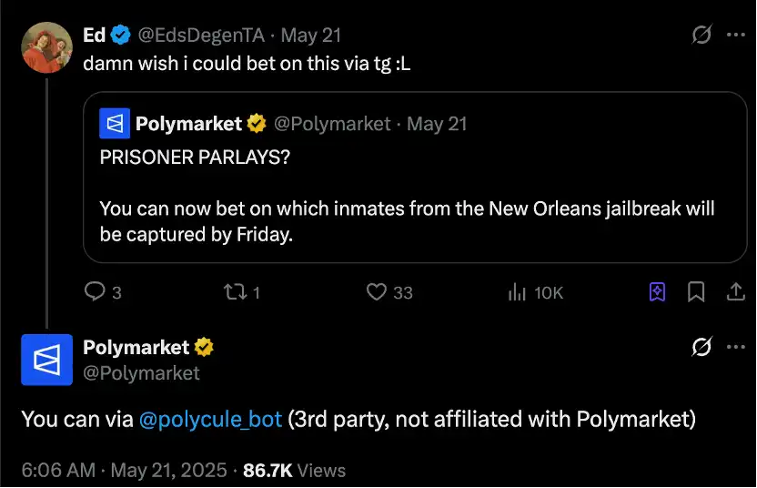 Polycule 是一键接入 Polymarket 的 Telegram 交易机器人,可以绕过域名限制实现通过聊天指令一键交易,解决了 Polymarket 在美国面临的一个关键使用痛点,并获得了 alliancedao 56w 美元的投资。