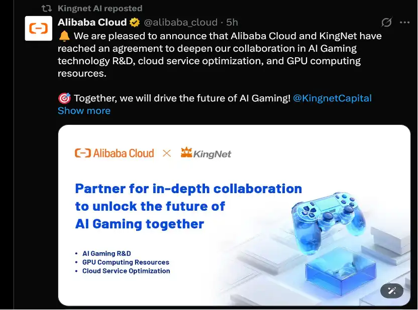 Knet 目前已与阿里云达成合作,由其提供 GPU 计算资源与云服务器,并与红杉资本投资的 ARAI、Swarms 达成 AI 模型合作,在技术资源与行业关系上具备天然优势。6 月 13 日,阿里云官方在 X 上与 Knet 的公开互动进一步引发市场 FOMO,币价创出阶段性高点。作为一个具备完整商业链条与强资源背书的项目,Knet 正成为「传统企业+AI+链上机制」的典型范式。