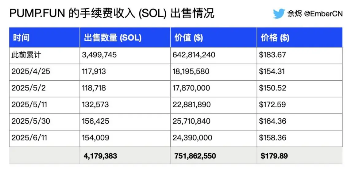 实际上,社区早已对 Pump.fun “怨声载道”。Pump.fun 每隔一到两周便会将累计的手续费收入转入 Kraken 交易所。过去一年多,平台共售出约417.9万枚 SOL,累计金额高达7.51亿美元,平均售价约为179.89美元。