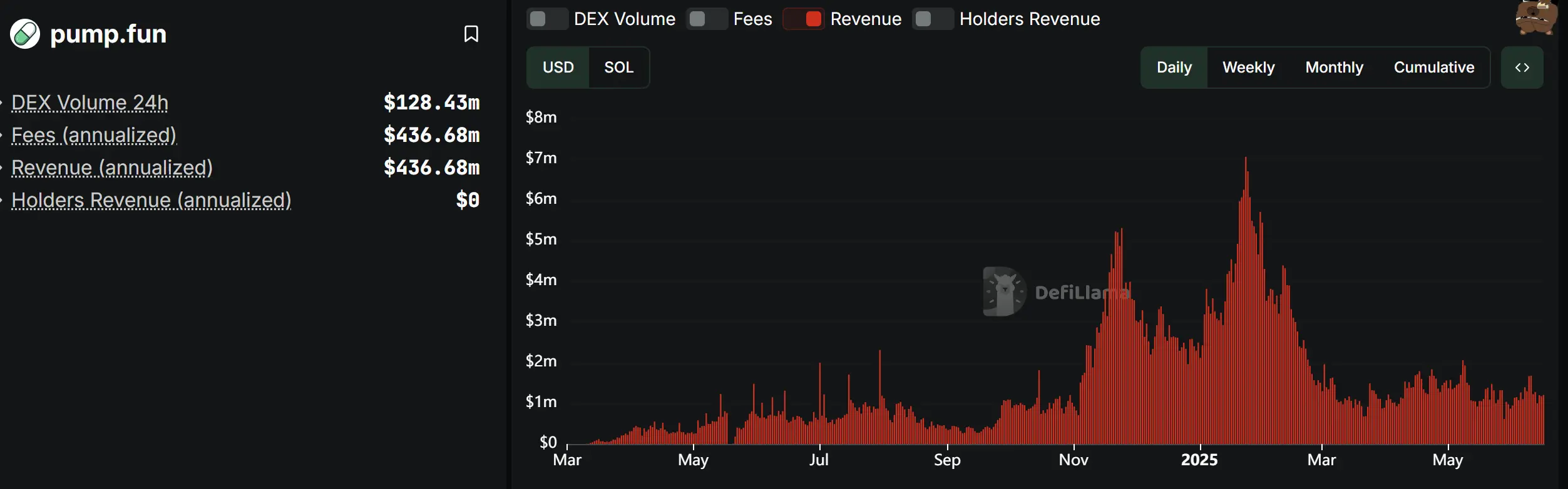 Pump.fun 早已不复巅峰。据 Defillama 数据,该平台在 1 月 23 日创下日收入超 700 万美元的峰值,但此后持续下滑,近期维持在每日 100 万美元附近。