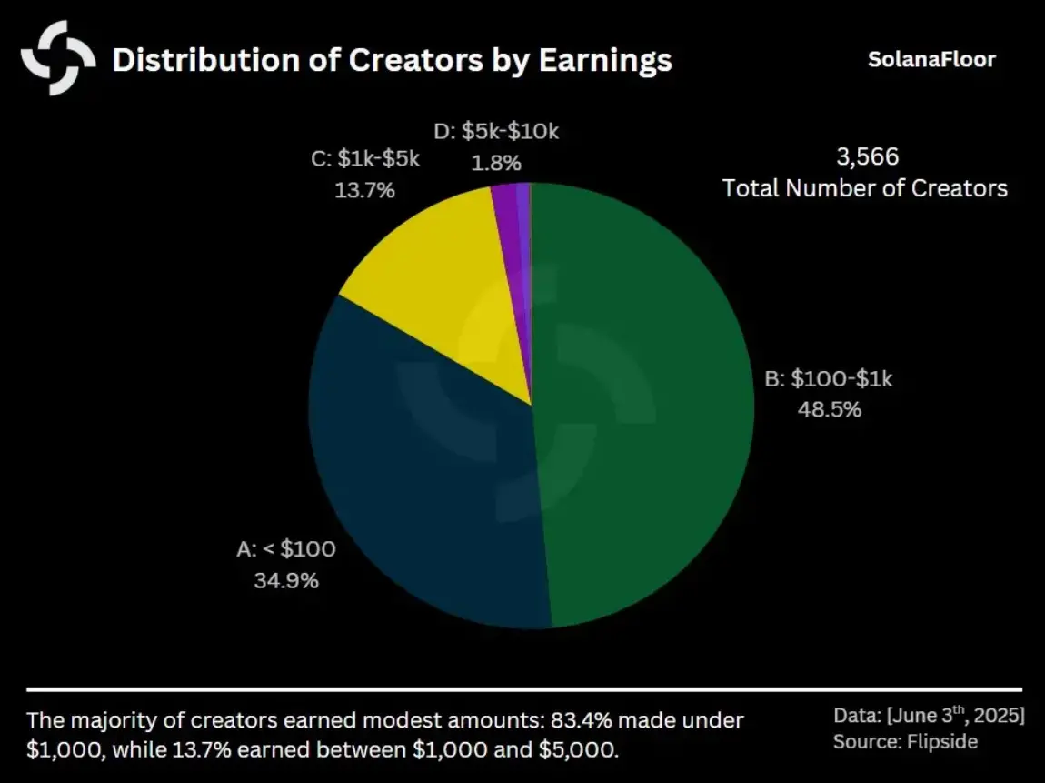 在Solanafloor 统计的 3566 名创作者中,83.4% 的创作者收入不足 1000 美元,其中 34.9% 的创作者收入低于 100 美元,48.5% 的创作者收入在 100 至 1000 美元之间。仅有 1.8% 的创作者能够获得 5000 美元以上的收入。