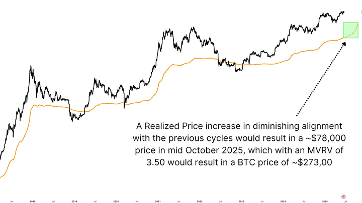结合预计的 7.8 万美元实现价格和保守的 3.5 MVRV 目标,我们得出比特币潜在价格峰值为 27.3 万美元。虽然这看似雄心勃勃,但历史上的抛物线式暴涨表明,这种走势可能在几周而非几个月内发生。尽管预计峰值更可能在 15 万至 20 万美元之间,但数学和链上证据表明更高估值至少是可能的。值得注意的是,这些模型会动态调整,若周期末期市场狂热加剧,预测可能迅速进一步加速。