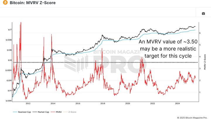 另一个强有力的指标是 MVRV 比率,它比较市场市值与实现市值,提供了投资者心理的窗口。该比率在主要周期通常在 4 左右达到顶峰,目前为 2.34 ,表明仍有显著上涨空间。历史上,当 MVRV 接近 3.5 至 4 时,长期持有者开始实现可观收益,通常标志着周期成熟。然而,由于回报递减,我们本周期可能无法达到完整的 4 。使用更保守的 3.5 估计,我们可以开始预测更现实的峰值。