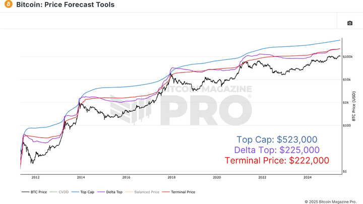我们首先来看《比特币杂志专业版》提供的免费价格预测工具,这些工具汇集了多个历史上较为准确的估值模型。虽然基于数据的反应通常比盲目预测价格更有效,但研究这些指标仍能为市场行为提供强有力的背景参考。当宏观经济、衍生品和链上数据开始发出警告信号时,通常是获利了结的好时机,无论是否达到某个具体价格目标。尽管如此,探索这些估值工具依然具有指导意义,并能在结合更广泛市场分析时辅助战略决策。