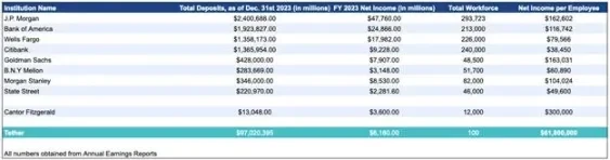 上面是我在文章《 Dust on Crust Part Deux 》中发布的表格,该表格使用 2023 年的数据证明了 Tether 是全球人均利润最高的银行。