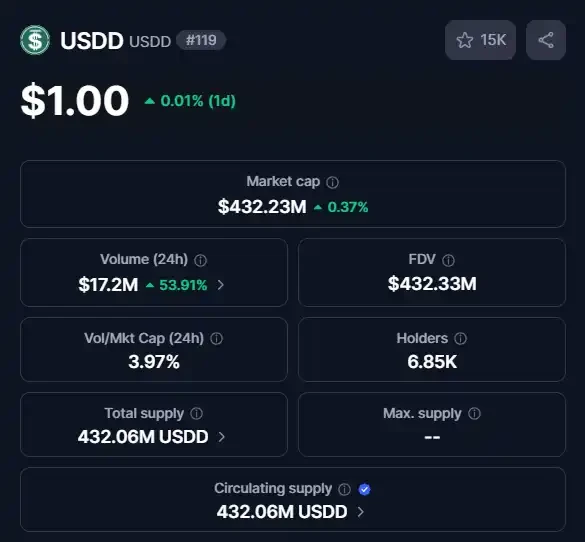 先说 USDD。USDD 是孙宇晨亲手主导推出的去中心化稳定币,由 Tron DAO Reserve 发行和管理,运行机制也是他一手设计。为了保证 USDD 不失去与美元的锚定,孙宇晨直接掌握了抵押池里最关键的资产——TRX、USDT、比特币等大额储备。每当市场波动、挂钩岌岌可危的时候,他多次用自有资金和储备仓位进行注资维稳,可谓是 USDD 的「幕后掌控人」。截至最新数据,USDD 的链上市值大约 4.32 亿美元,稳定币市值排名大概排在第 10 。