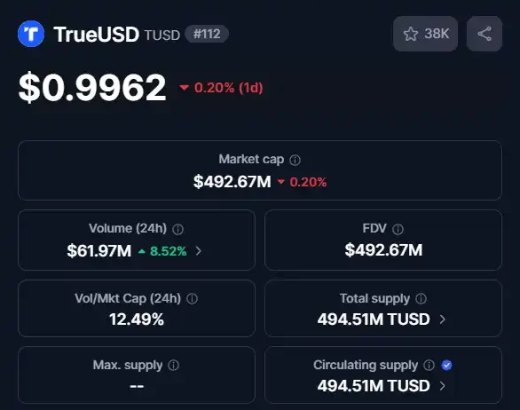 再说 TUSD。虽然 TUSD 表面上不是孙宇晨个人名下的资产,但多方链上证据与资金流向基本坐实了他的影子控股地位。自 2023 年起,TUSD 成为 TRON 和 HTX(前火币)流动性的重要支撑币种。然而,这颗棋子也不是没有风险:TUSD 因托管与审计争议多次失锚,还被 SEC 盯上起诉。2024 年 Binance 下架了它的主力交易对,到了 2025 年,更因为 MiCA 监管的落地在欧盟全面下架,仅保留提取通道。为了救场,孙宇晨不得不在 2025 年年初自掏腰包砸下超过 4 亿美元,亲自维稳 TUSD,进一步把这颗稳定币牢牢绑在了自己名下,目前 TUSD 的市值是 4.926 亿美元。