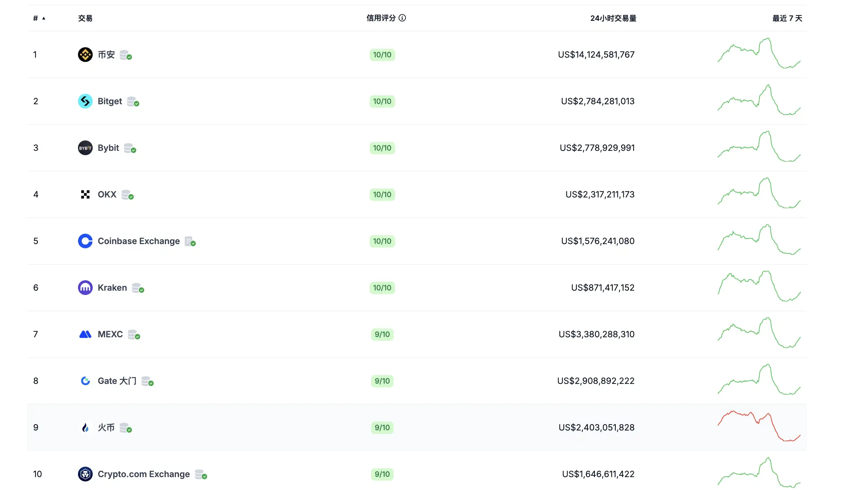 截至目前,火币仍占据市场前 10 大交易平台的地位,日交易量达到 24 亿美元。