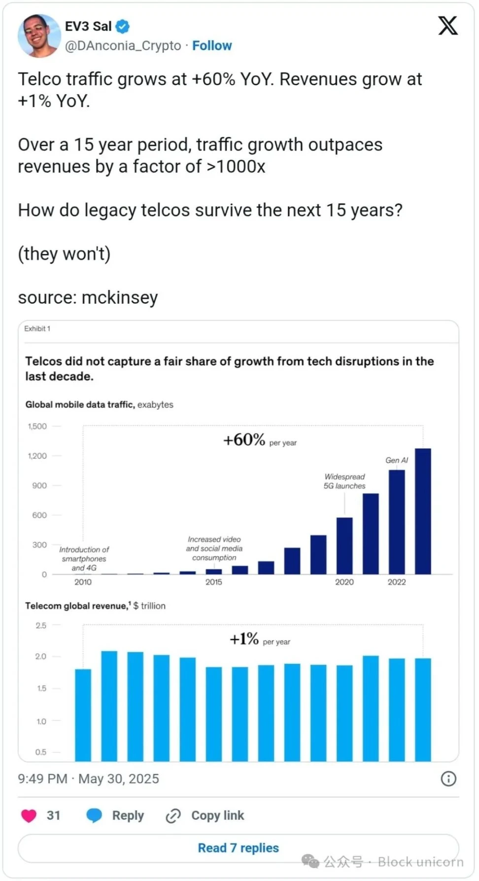 这就是平台颠覆的样子。电信流量年同比增长 60% ,收入年同比增长 1% 。在 15 年内,流量增长超过收入增长 1000 倍以上。