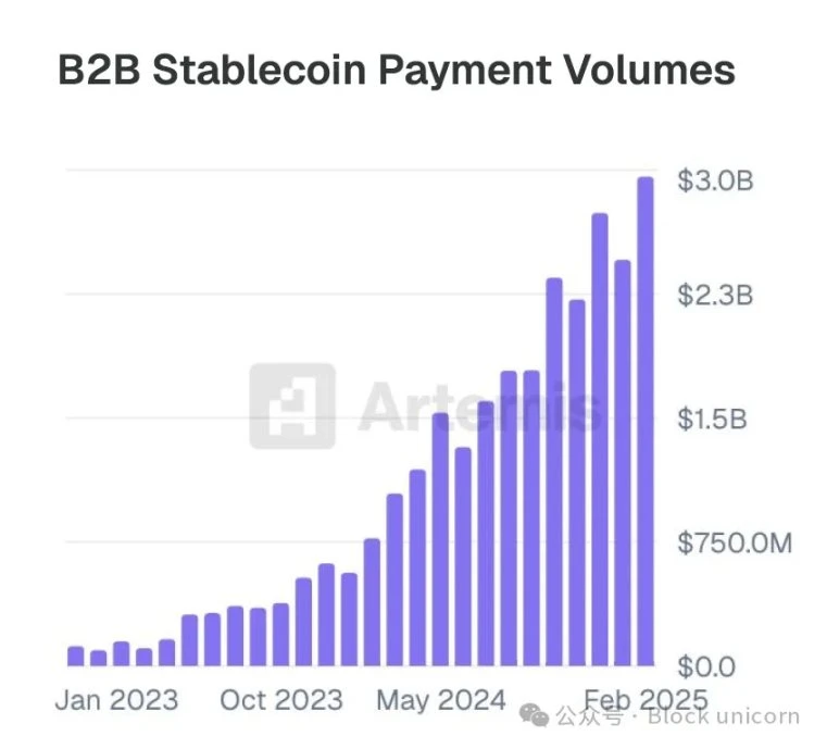 Artemis 调查了 30 多 家从事稳定币业务的公司,发现 B2B 作为一个类别,年同比增长 400% (且在加速),使其成为增长最快的类别。(注意:下图显示的交易量仅为整体市场的一部分)