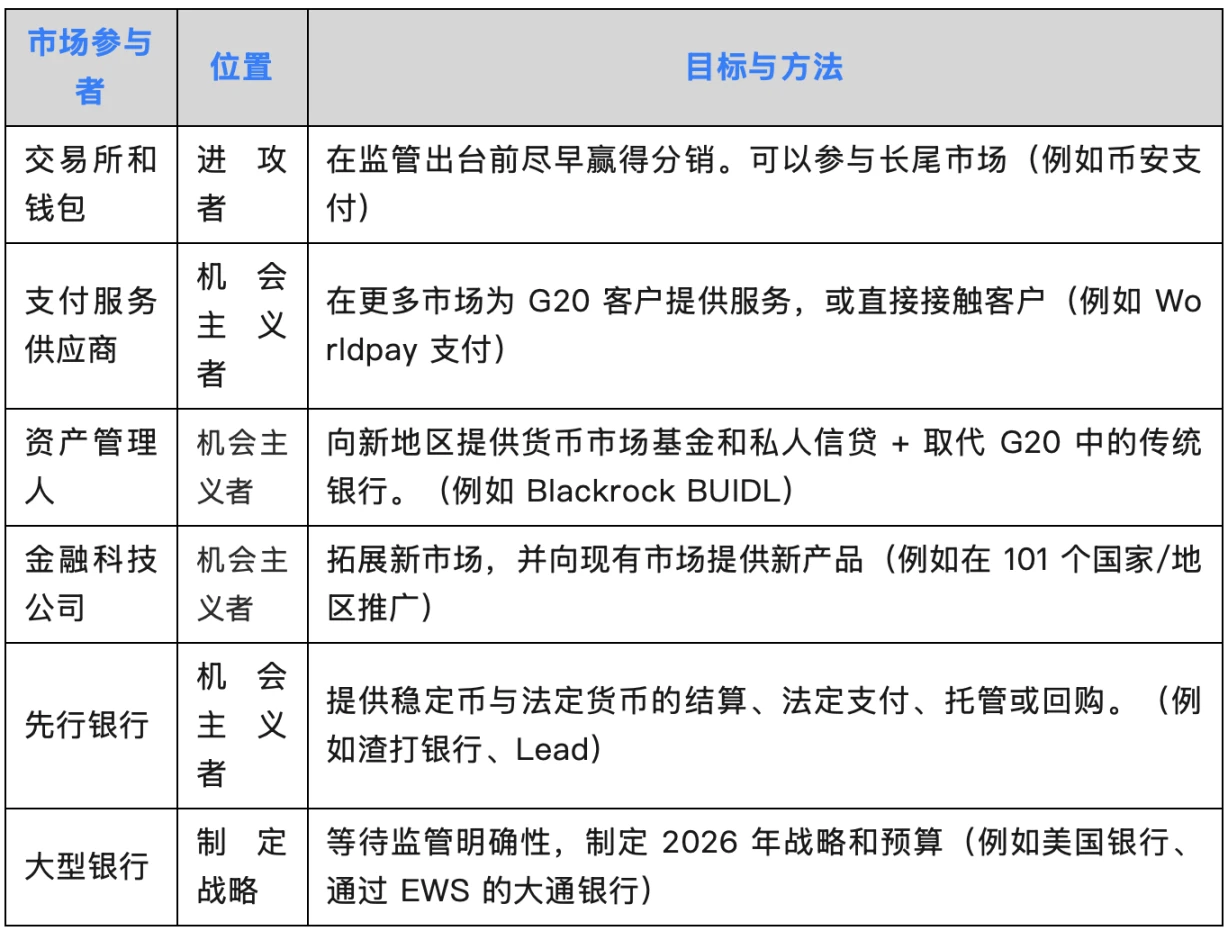 现实情况是,机会因用例而异。初创公司正在探索新的支付流程,而支付服务供应商(PSPs)则通过现有流程扩展市场准入。未来,资产管理公司和银行将在市场中找到自己的定位,可能更接近其现有核心业务。
