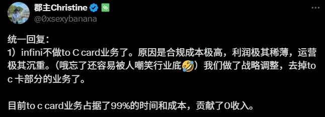 6 月 17 日,Infini 联创郡主 Christine 在 X 上发帖,宣布停止面向消费者的加密 U 卡业务,同时也详细阐述了背后的原因: