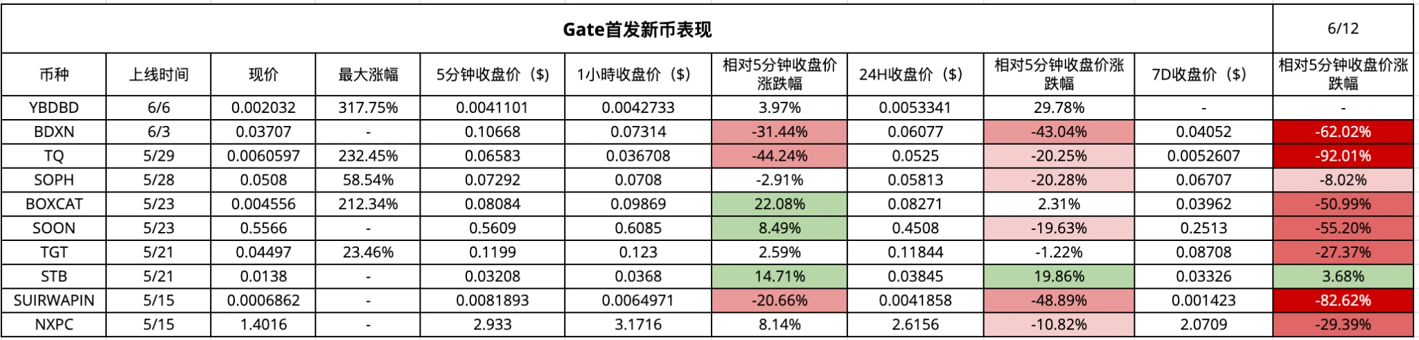 对此我们选取 2025 年 5 月 1 日至 6 月 12 日 这一近六周窗口,对 Bybit、OKX、Bitget、Gate 与 LBank 五家交易所的首发代币进行横向对比。通过统计各平台首发数量、上市后不同周期(5 分钟、 1 小时、 24 小时、 7 日)的价格表现与成交深度,