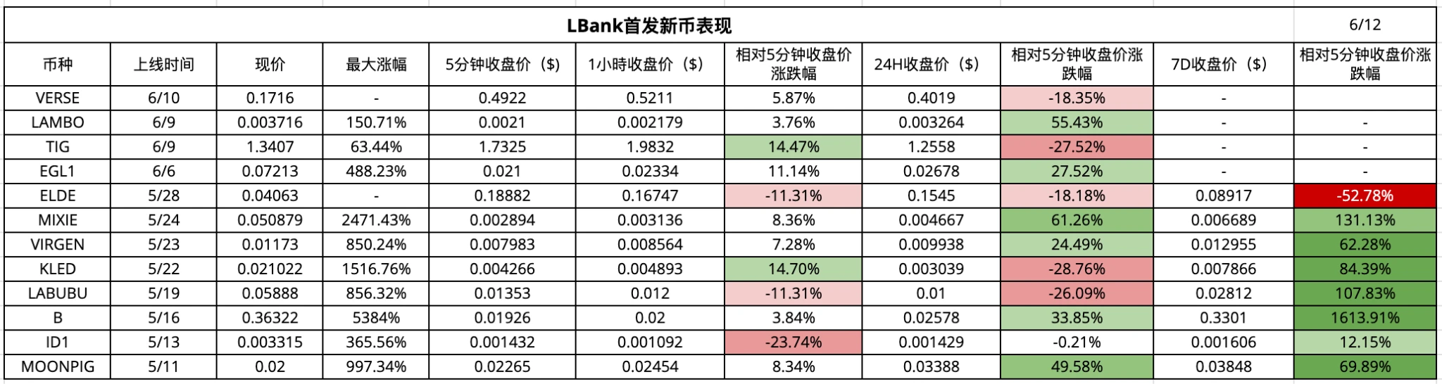 LABUBU – “过山车之后再创新高”: LABUBU 于 5 月 19 日首发(LBank 等多家同时上线)。该币开盘价约$ 0.0135 。与多数新币类似,LABUBU 在刚上线即经历暴涨暴跌:据数据统计,其上线当日盘中最高涨幅达到 8.56 倍(可能发生在开盘瞬间),但很快回吐大部分涨幅, 5 分钟收盘价回落至$ 0.0135 附近。此后 1 小时继续下探至约$ 0.012 (跌破开盘价约 11% ), 24 小时收于$ 0.0100 附近(较开盘价下跌约 26% )。可见在首日追高的投资者大多陷入浮亏。不过,LABUBU 在接下来几天出现触底反弹:上线一周后价格回升到$ 0.0281 ,重新涨回开盘价的 2 倍以上。进入 6 月,LABUBU 延续强势,截至当前约$ 0.0589 ,较开盘价上涨约 3.4 倍。这一走势表明,短线交易(首日卖出)虽可避免日内回撤风险,但也错失了此后数倍上涨的机会;而中长期持有者在熬过初期震荡后反而获得更高收益。当然,这种先抑后扬的新币并非普遍现象,但 LABUBU 的案例揭示了“首日深套、随后解套翻倍”的可能路径。