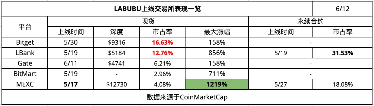 LABUBU 跨平台表现:LABUBU 于 5 月中下旬几乎同时登陆多家交易所,但各平台交易情况迥异。MEXC 抢先在 5 月 17 日上线 LABUBU,是最早的平台之一,随之出现了最高 12.19 倍的首日涨幅。两天后的 5 月 19 日,LBank 和 BitMart 也同步首发该币:其中 LBank 凭借经验丰富的用户群和流动性支持,使 LABUBU 首日最高涨至约 8.56 倍开盘价;而 BitMart 由于体量较小、深度有限,反倒激发出 11.11 倍的更高涨幅——这暗示在流动性薄弱的平台上,小资金也能推升价格大幅波动。直到 5 月 30 日,Bitget 才姗姗上线 LABUBU,此时市场热度已减弱,Bitget 上该币高点涨幅仅约 1.58 倍,行情相当平淡。更晚的 Gate(6 月 11 日上线)同样只有约 1.58 倍的小幅波动。上线时间差在这里再次扮演关键角色:越晚进入,涨幅越小。