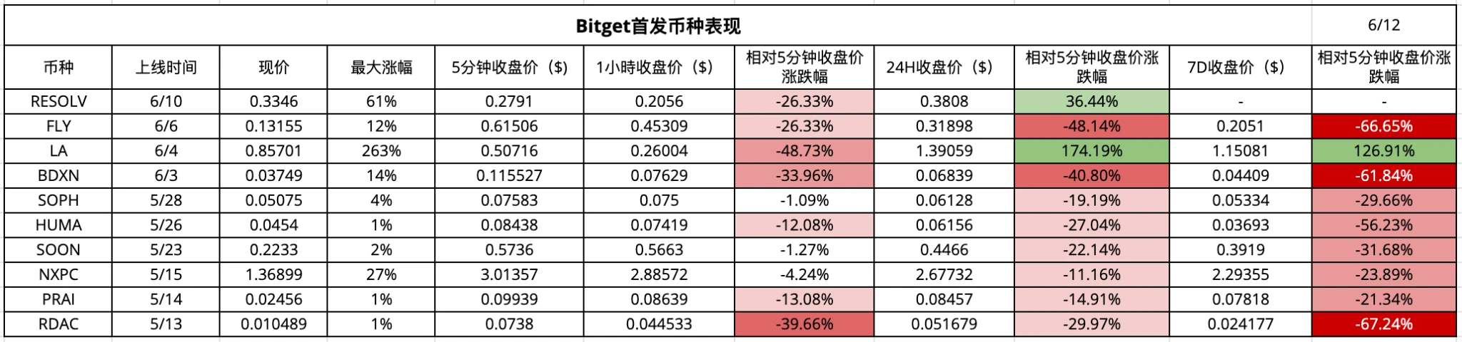 整体而言,Bitget 在 5 – 6 月的 36 枚新币呈现明显右偏收益分布:仅有 LA 一枚在 7 日区间内仍保持约 1.3 倍的涨幅,勉强跻身“翻倍俱乐部”;另有寥寥数枚(约占总样本的 15% )录得 0% – 30% 的小幅上涨;约四分之一的代币跌幅落在 – 10% 至 – 30% 范围,表现可谓温和;而超过一半的项目则在首周遭遇 – 30% 至 – 70% 的深度回撤,包括 FLY、BDXN、RDAC 等典型案例。综合估算,Bitget 新币的 7 日平均跌幅约 – 28% ,中位跌幅约 – 31% ,七日“红盘”概率不足四分之一。这意味着平台整体赚钱效应集中在极少数热门标的,绝大多数新币在合约空头与流动性骤降的双重夹击下快速沉没,首周即完成“淘汰赛”。