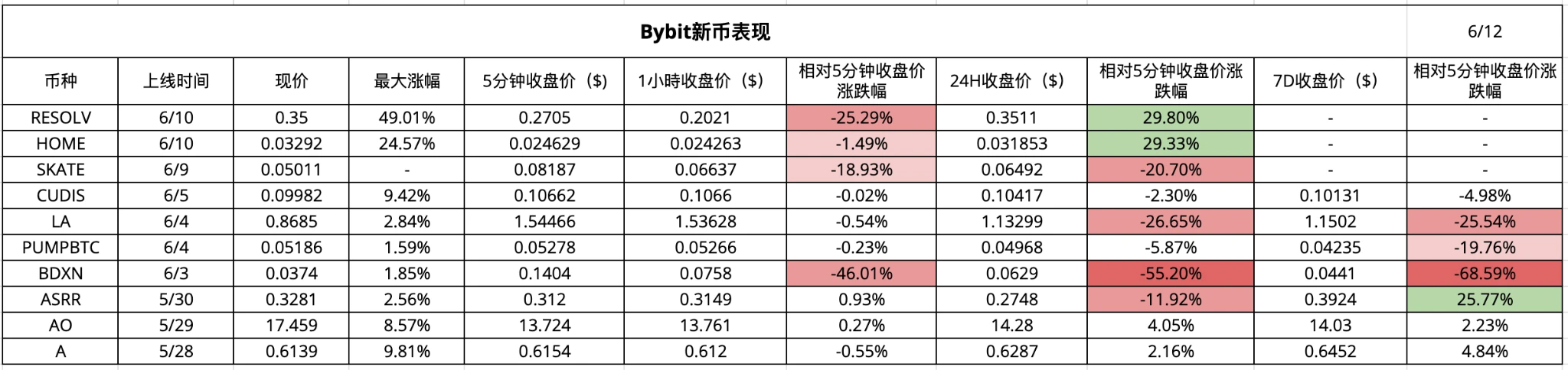 在 2025 年 5 月 1 日至 6 月 12 日这六周窗口,Bybit 共全球或同步首发 18 枚新代币,平均大约 每 2-3 天推出 1 枚。品类以 Meme 与新公链生态代币居多, 占比接近七成。在本轮样本中,Bybit 的新币仍延续“秒表行情”特征:RESOLV 与 HOME 在 24 小时内相对 5 分钟收盘价反弹近 30% ,但拉升多集中于开盘后的几根 K 线;一旦买盘退潮,价格迅速回吐。BDXN 是典型的“过山车”—— 5 分钟价 0.1404 美元, 7 日仅剩 0.0441 美元,跌幅高达 68.6% 。除 ASRR(+ 25.8% )与 AO(+ 2.2% )外,其余币种 7 日表现全数转负,说明 Bybit 的新币热度更偏向超短期投机;若未能在首小时兑现收益,持仓价值往往难逃阶梯式下行。