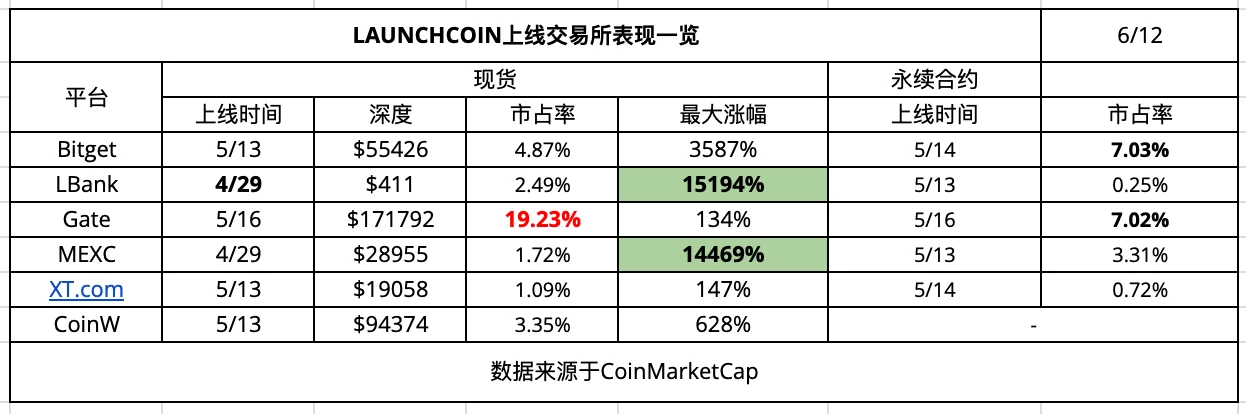LAUNCHCOIN 跨平台表现:LAUNCHCOIN 的跨平台交易展现出“先上者狂欢,后上者平淡”的极端反差。作为 meme 热潮中的明星,LAUNCHCOIN 先后于 4 月 29 日在 LBank、MEXC 等平台首发,引爆了百倍神话(LBank 上最大涨幅约 151.94 倍;MEXC 亦高达 144.69 倍)。早期上线的平台因为聚集了最初的市场激情,价格扶摇直上。但这种行情并未普遍复制到后来的交易所: 5 月 13 日 Bitget 加入交易,LAUNCHCOIN 最高涨幅约 35.9 倍—尽管不及首发平台夸张,但相对多数新币而言仍是巨大的涨幅。到了 5 月 16 日,Gate 才开始交易该币。得益于此前各平台已完成价格发现,Gate 上的 LAUNCHCOIN 开盘即是相对合理价,首日最高仅上涨 34% (1.34 倍)便趋于平稳,几乎看不到投机热浪。这种差异与各平台的用户构成和风控也有关系:LBank 和 MEXC 用户以追逐热点著称,敢于高价追买推动行情;Gate 用户群体和做市商则倾向于提供深厚流动性(Gate 上线时挂单深度高达$ 171, 792 ,为各平台之最),抑制了暴涨的可能。